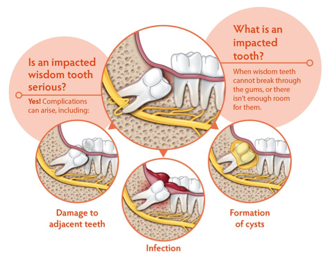 Incluso las muelas del juicio sanas requieren limpiezas regulares, revisiones anuales y radiografías por un profesional. Las muelas del juicio impactadas pueden necesitar ser extraídas debido a una enfermedad periodontal (infecciones de las encías), daño a los dientes adyacentes o si se forman quistes o tumores.