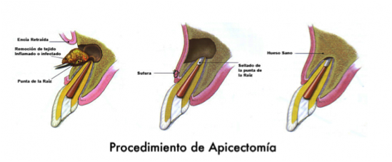 - Apicectomía:Se requiere cuando el tratamiento de endodoncia en un diente no es suficiente, generalmente en los casos en el que el proceso infeccioso se encuentra más allá de la raíz del diente, hacia el hueso circundante. Consiste en la extracción de la porción infectada de la raíz del diente y del hueso circundante.